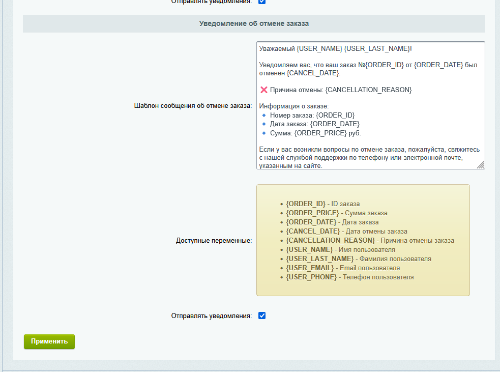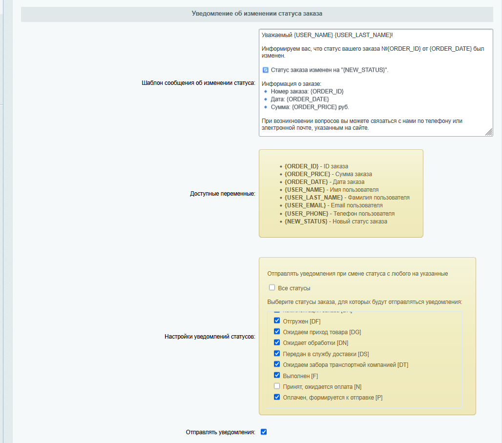 - На странице Астониа (в левом меню админки иконка) -> Уведомления о заказах пользователям в Telegram необходимо отредактировать под себя шаблоны и включить отправку для уведомлений о новом заказе, об изменении статуса заказа (а также есть возможность настроить, какие конкретно статусы должны оповещаться) и об отмене заказа.