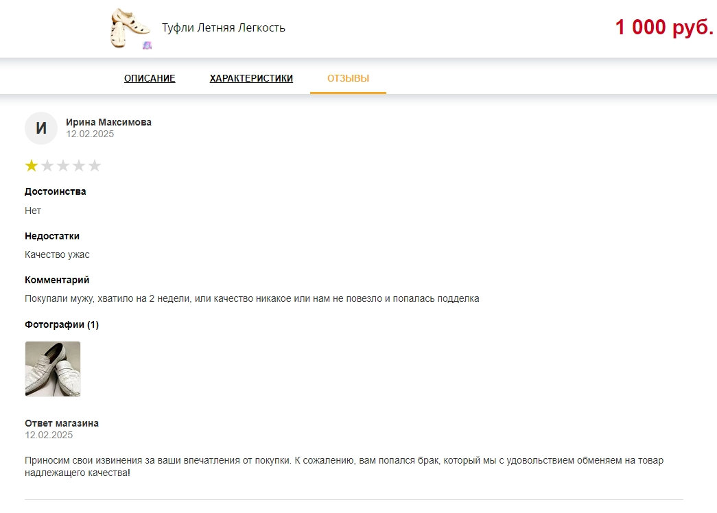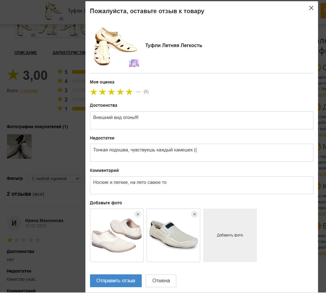 2. Расширенные отзывы только на реально купленные клиентом товары с возможностью добавить фото, поставить оценку и отдельно указать достоинства и недостатки.