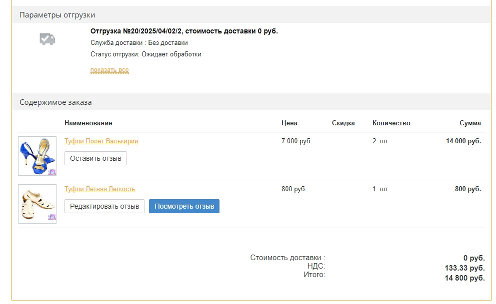 5. Вывод кнопок добавления/редактирования и просмотра отзывов товаров в личном кабинете на детальной странице заказа