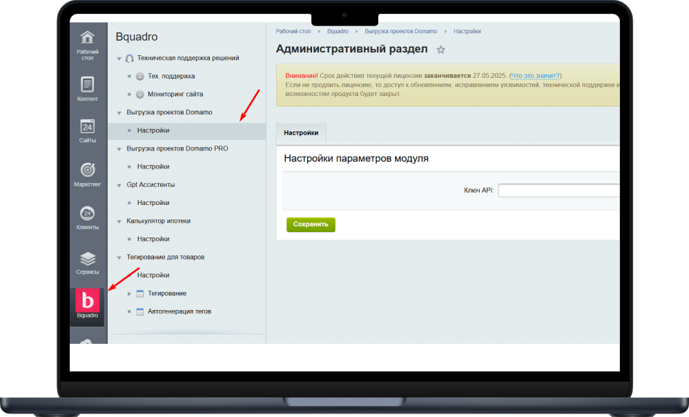 - Вставьте API-key в настройках модуля на своем сайте