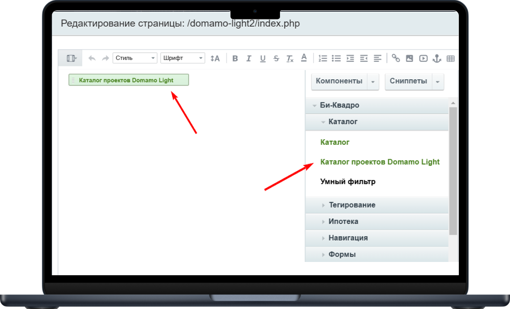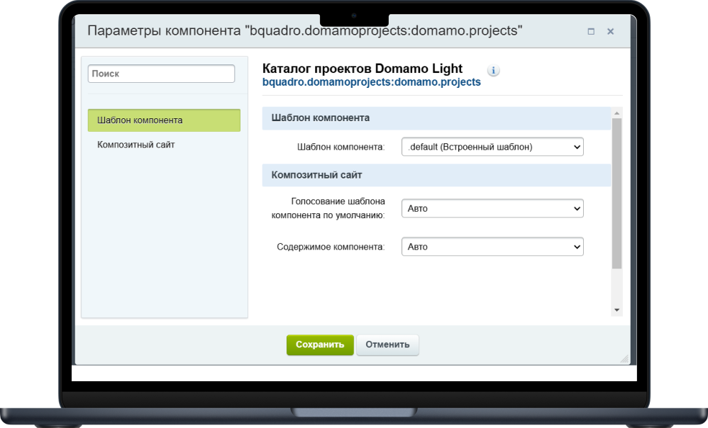 - Разместите на нужной странице сайта компонент “Каталог проектов Domamo”