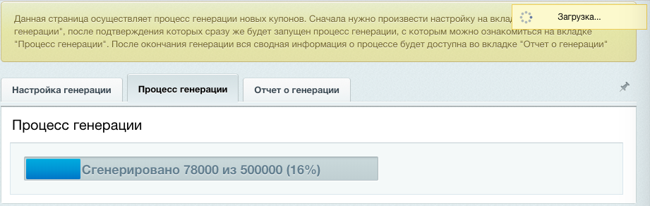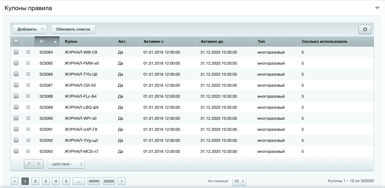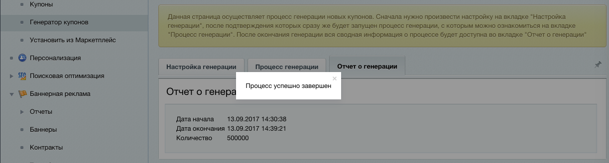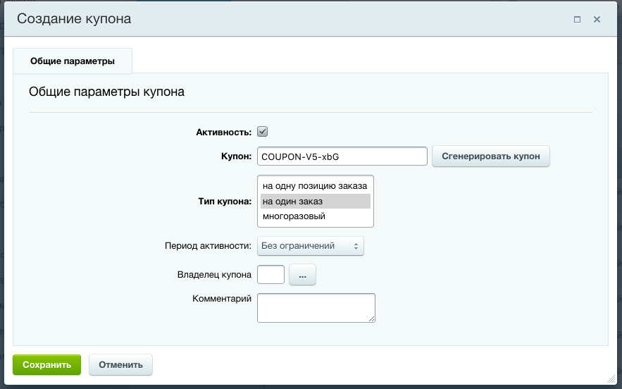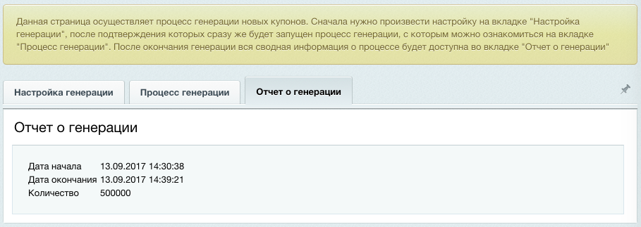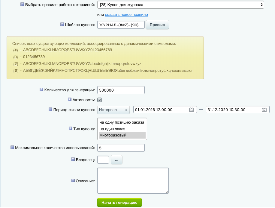 - генерация одного или нескольких купонов на основании заданного шаблона (Пункт меню "Маркетинг > Товарный маркетинг > Генератор купонов")
