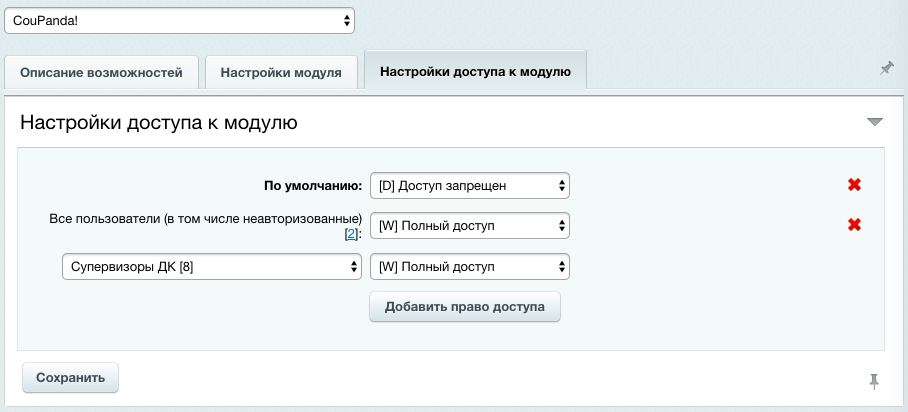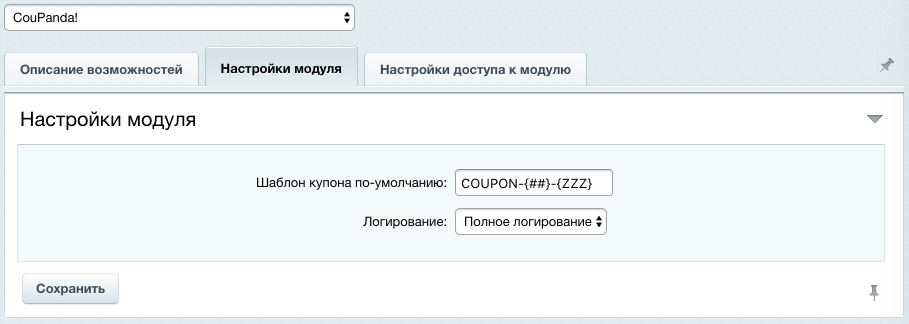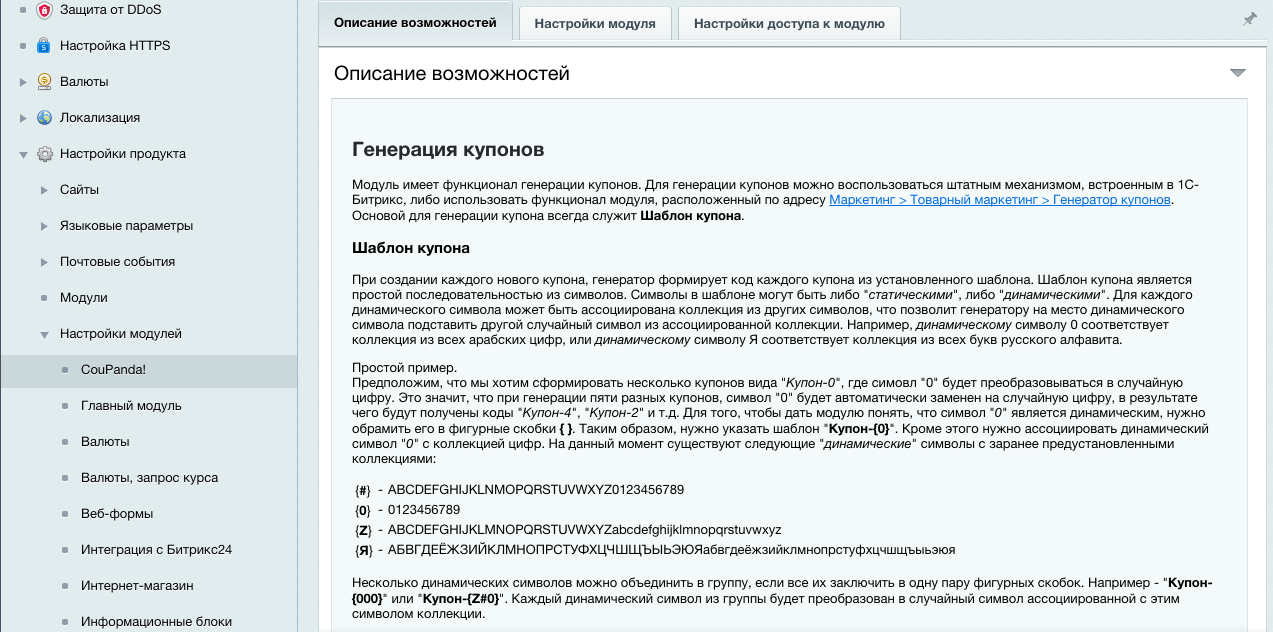 Подробно о возможностях модуля и всех возможных настройках можно прочитать на вкладке "Описание возможностей" на странице настроек модуля в разделе "Настройки > Настройки продукта > Настройки модулей > CouPanda!" Техническая поддержка осуществляется по адресу электронной почты, а также на странице сервиса https://maximaster-coupanda.freshdesk.com/