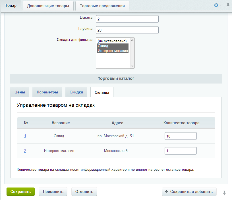 Модуль позволяет добавить в умный фильтр возможно отбора товаров по складам. Особенно актуально для редакции 1С-Битрикс: Бизнес, где можно завести несколько складов в складском учете.
