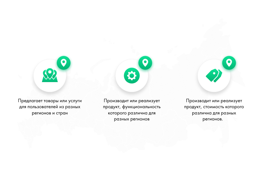 Предлагает товары или услуги для пользователей из разных регионов и стран | Производит или реализует продукт, функциональность которого различна для разных регионов | Производит или реализует продукт, стоимость которого различна для разных регионов |