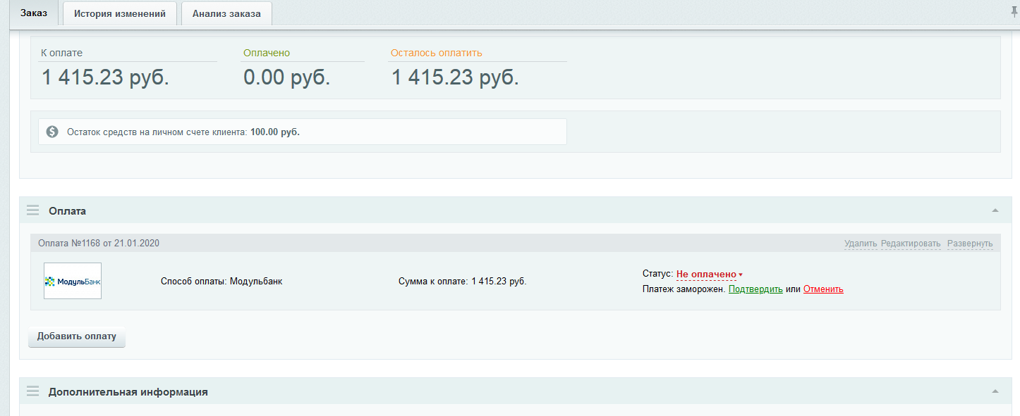 Модуль поддерживает двухстадийный платеж. Подтверждение платежа осуществляется на странице просмотра заказа в боке оплаты.