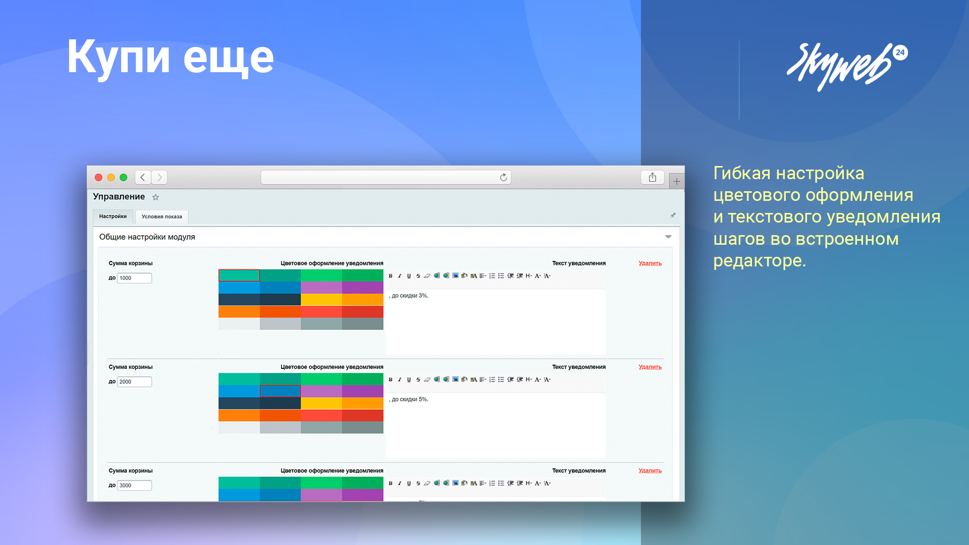 После установки модуля, необходимо перейти в настройки модуля, во вкладке «Настройки» → «Настройки продукта» → «Настройки модулей» → «Купи еще» и настроить уведомления для ценовых диапазонов.