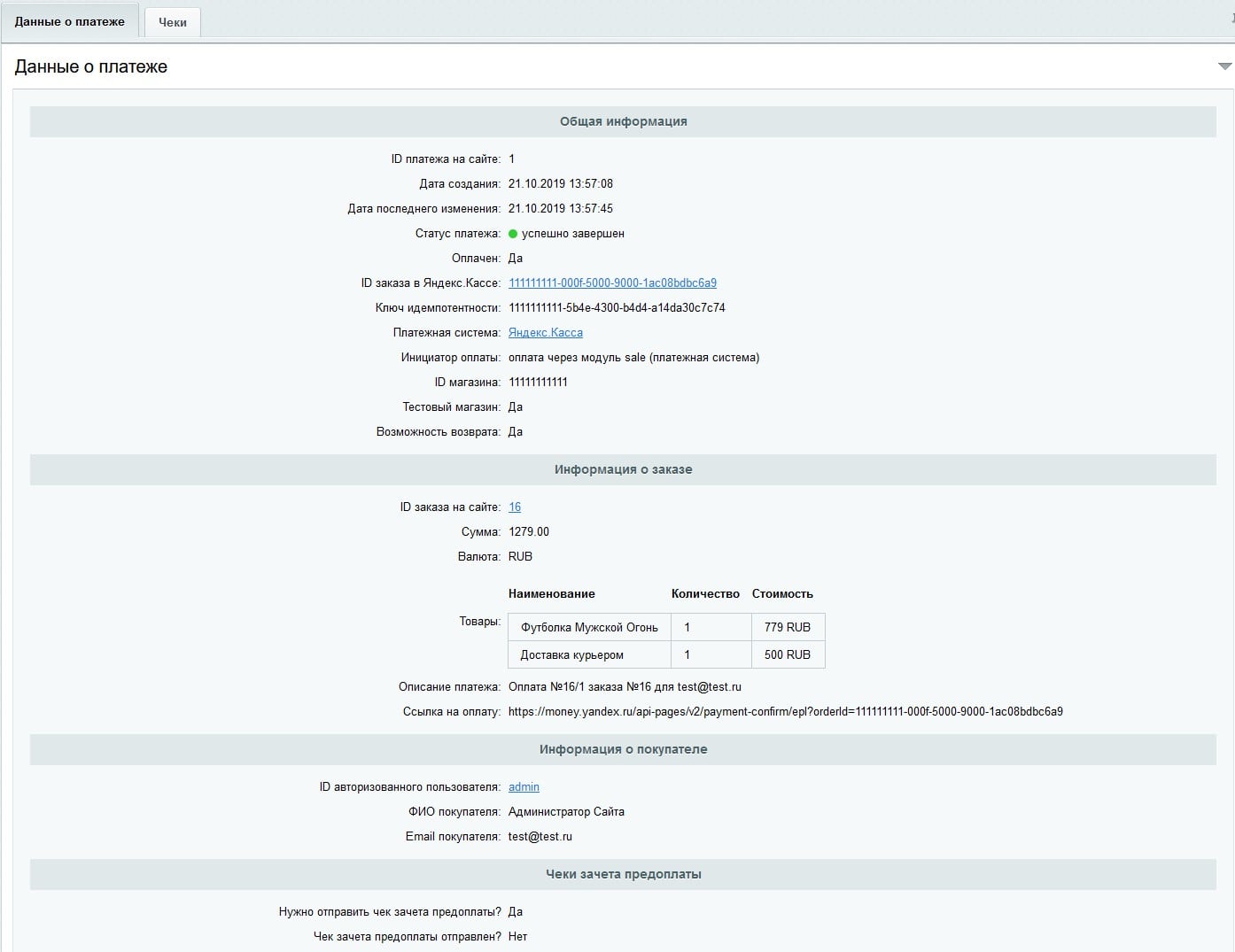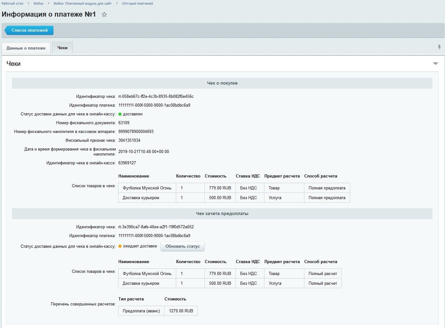 6. Протестируйте прием платежей на Вашем сайте и проверьте историю платежей на странице "Мибок → Мибок: Платежный модуль для сайта → История платежей".