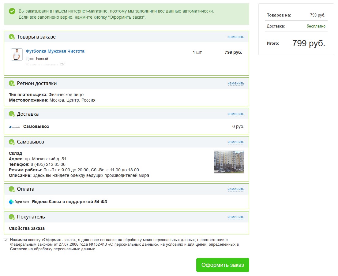 - Поддержка 54-ФЗ (передача данных чека в формате ФФД 1.05 и ФФД 1.2 через ЮКасса для дальнейшей передачи партнерам) и 152-ФЗ (возможность вывода блока с соглашением на обработку персональных данных)