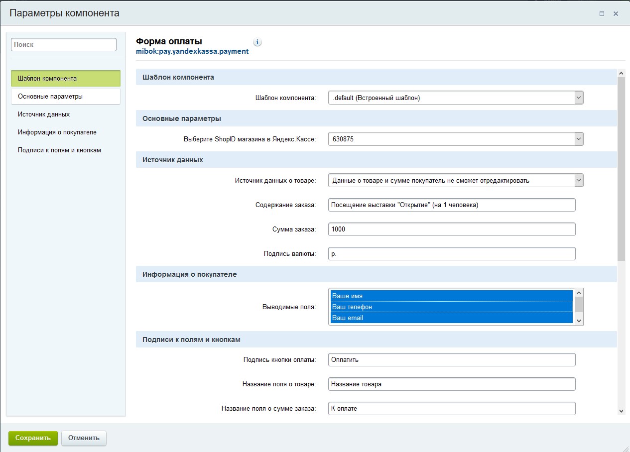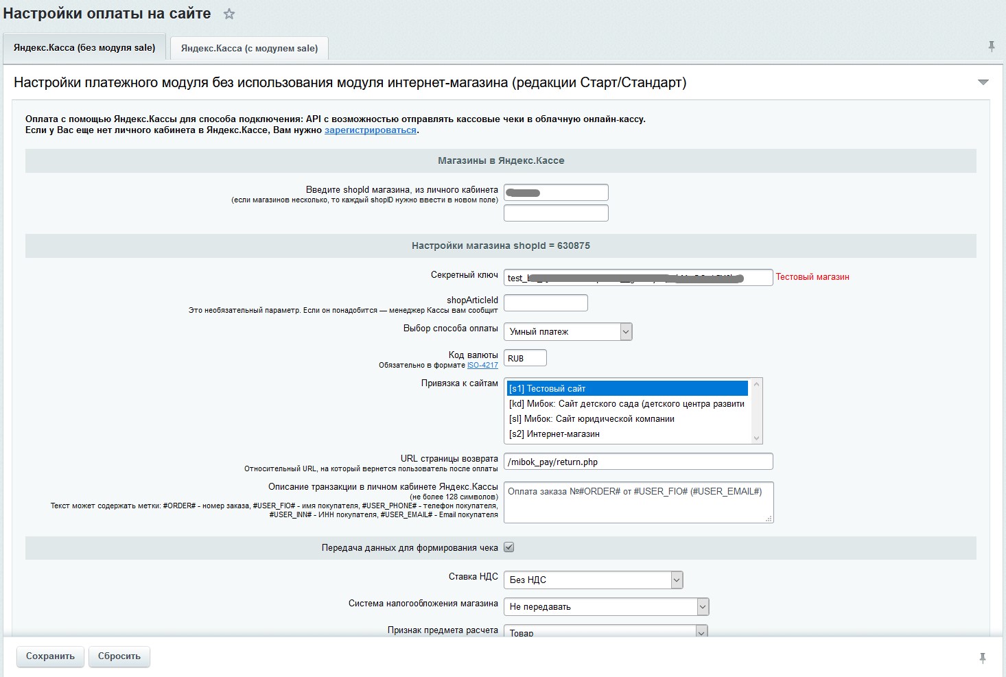 - Для приема платежей в 1 клик (подходит для любой редакции Битрикс): перейдите на страницу "Мибок → Мибок: Платежный модуль для сайта → Настройки оплаты → вкладка ЮKassa (без модуля sale)" и введите все необходимые данные для подключения платежей. После чего разместите в публичной части сайта компонент "Форма оплаты" (mibok:pay.yandexkassa.payment) и настройте его.