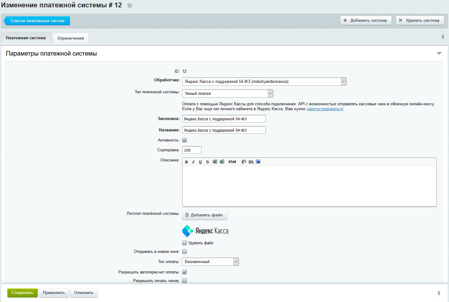 - Для приема платежей при оформлении заказа (подходит только для редакций "Малый бизнес" и "Бизнес") перейдите на страницу "Мибок → Мибок: Платежный модуль для сайта → Настройки оплаты → вкладка ЮKassa (c модулем sale)" или сразу на страницу списка платежных систем "Магазин → Настройки → Платежные системы". Нажмите на кнопку "Добавить платежную систему" и выберите пользовательский обработчик "ЮKassa с поддержкой 54-ФЗ (mibokyandexkassa)". После чего заполните все необходимые поля.