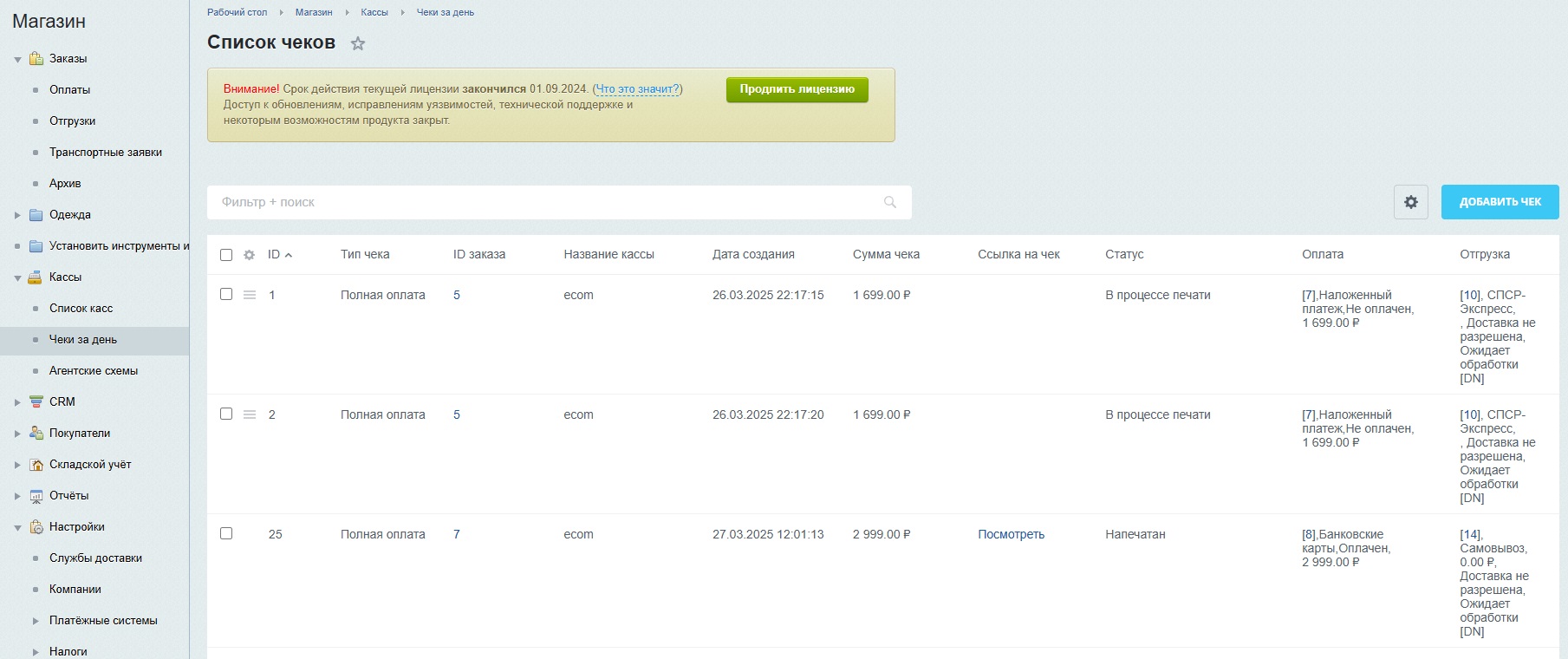 Перейдите в раздел "Магазин" - "Кассы" - "Список касс" и нажмите кнопку "Добавить кассу".