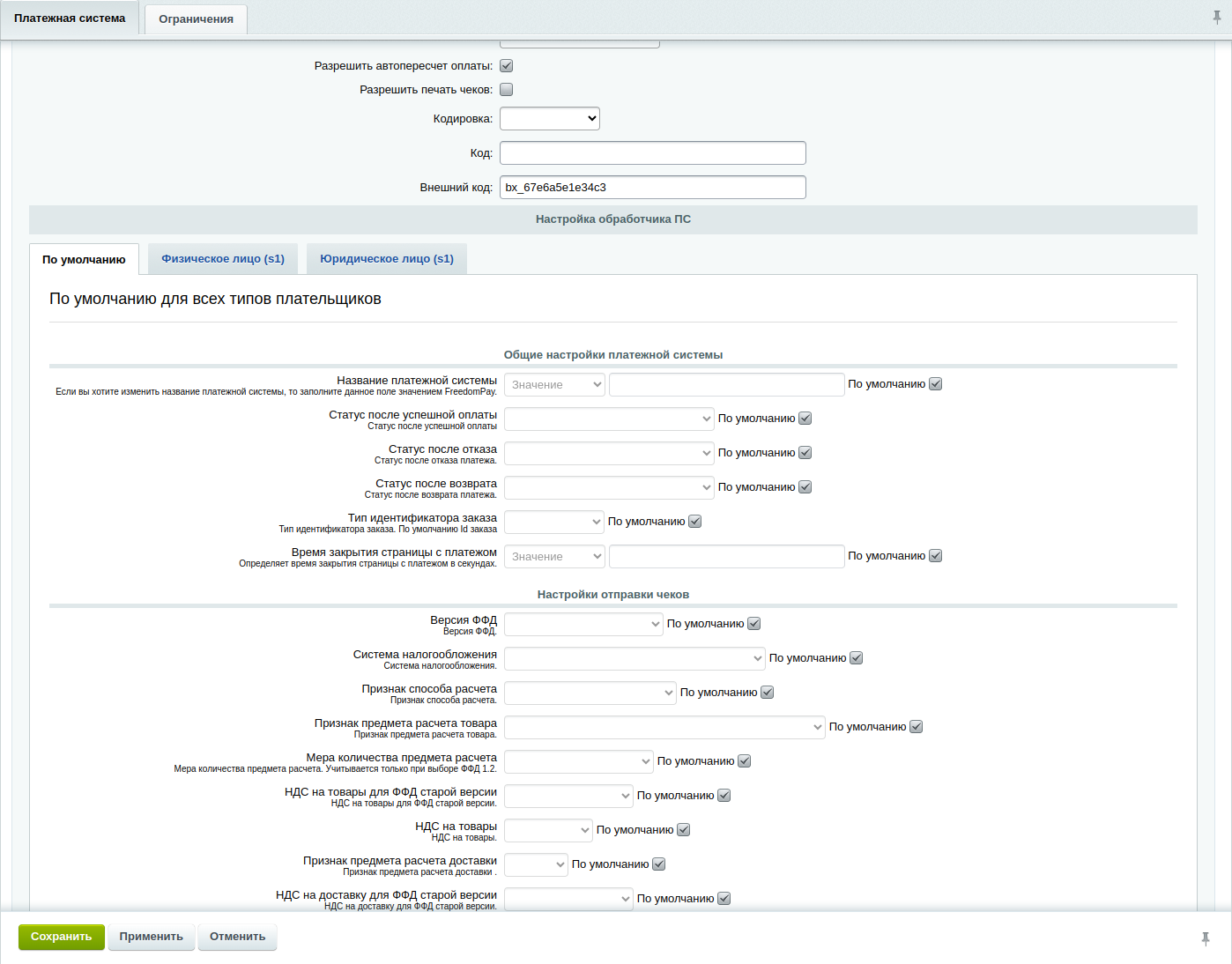- После регистрации, Вы получите секретные ключи доступа к системе. Далее необходимо будет создать платежную систему, использующую обработчик FreedomPay, это делается во вкладке "Магазин – Настройки – Платёжные системы", после чего ввести в настройках платежной системы данные вашего магазина, в том числе и секретный ключ.