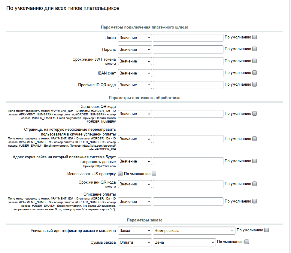 4. Перейти на вкладку «По умолчанию». (Вкладки «Физическое лицо» и «Юридическое лицо» заполнять не нужно, настройки «По умолчанию» работают для всех типов плательщиков).