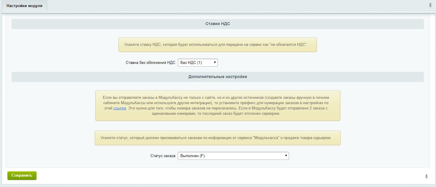 7. Дополнительные настройки: выберите статус, в который будет переходить заказ после того, как он будет проведен на кассе. Если вы используете несколько интеграций, или создаете заказы вручную в личном кабинете МодульКассы, то установите префикс в настройках модуля "Интернет-магазин" в графе "Шаблон генерации номера заказа". Попасть туда можно по ссылке, указанной в информационном окне. Если возникнут вопросы — обращайтесь по телефону 8 800 100-66-62 или напишите письмо на адрес: info@conversite.ru