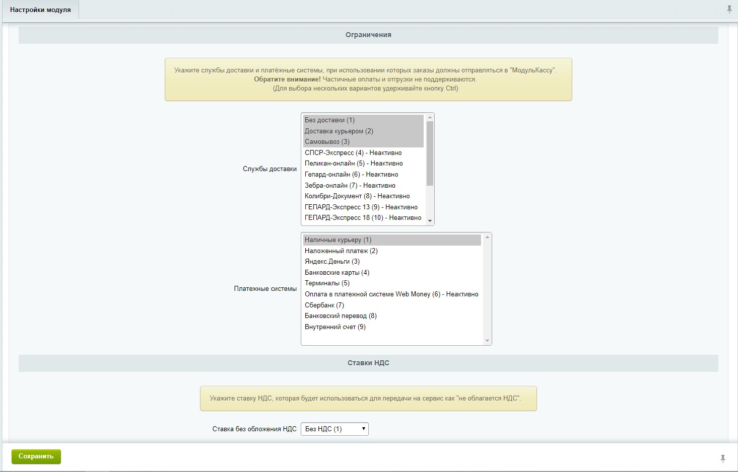 5. Ограничения: укажите службы доставки и способы оплаты, для которых необходимо отправлять заказы в МодульКассу