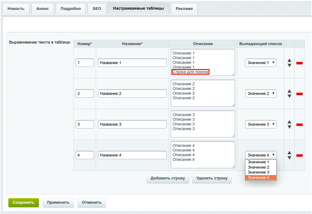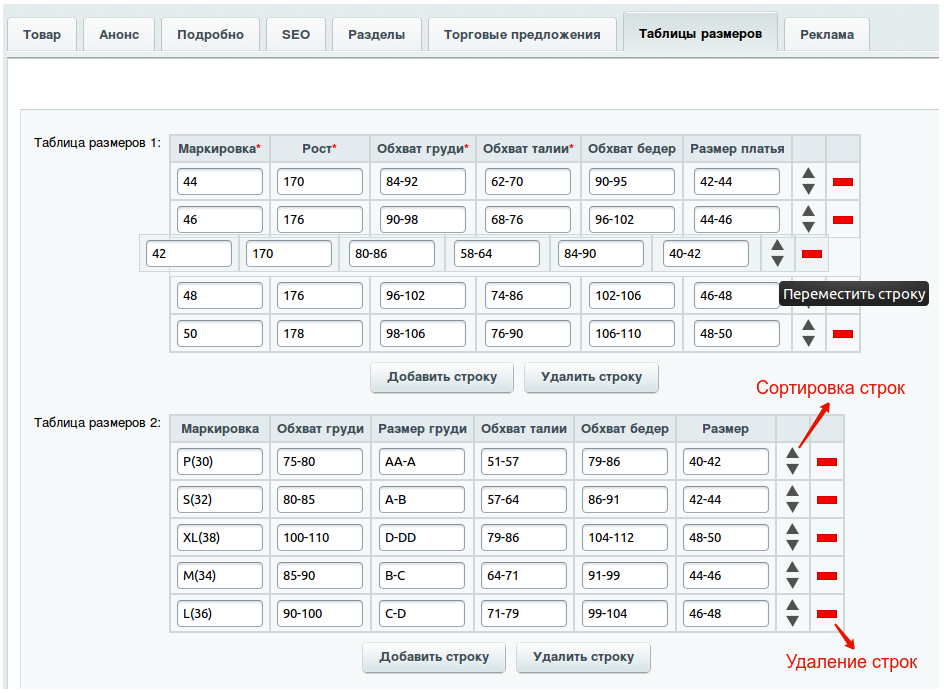 - перетаскивание (сортировка) строк;