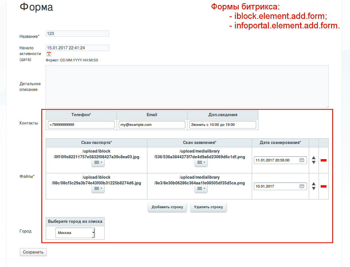 В версии 1.0.5 таблицы можно использовать в формах битрикса. Для доступа к календарю, файлам, привязке к элементам у пользователя, заполняющего форму, должны быть соответствующие разрешения.Поменялась логика построения значений множественной таблицы.