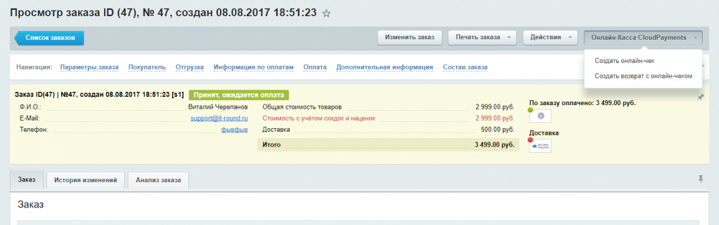 Интеграция на страницу заказа предоставляет возможность выставить онлайн-чеки на ранее созданные заказы (вручную), также есть возможность сделать онлайн-чек на возврат денежных средств!