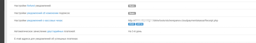 После настройки модуля - перейти в личный кабинет сервиса CloudPayments, и в поле "Настройкиуведомлений о кассовых чеках":