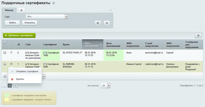 5) купленные сертификаты и их статусы можно отслеживать в разделе Маркетинг - Подарочные сертификаты. Свои вопросы и пожелания вы можете написать: