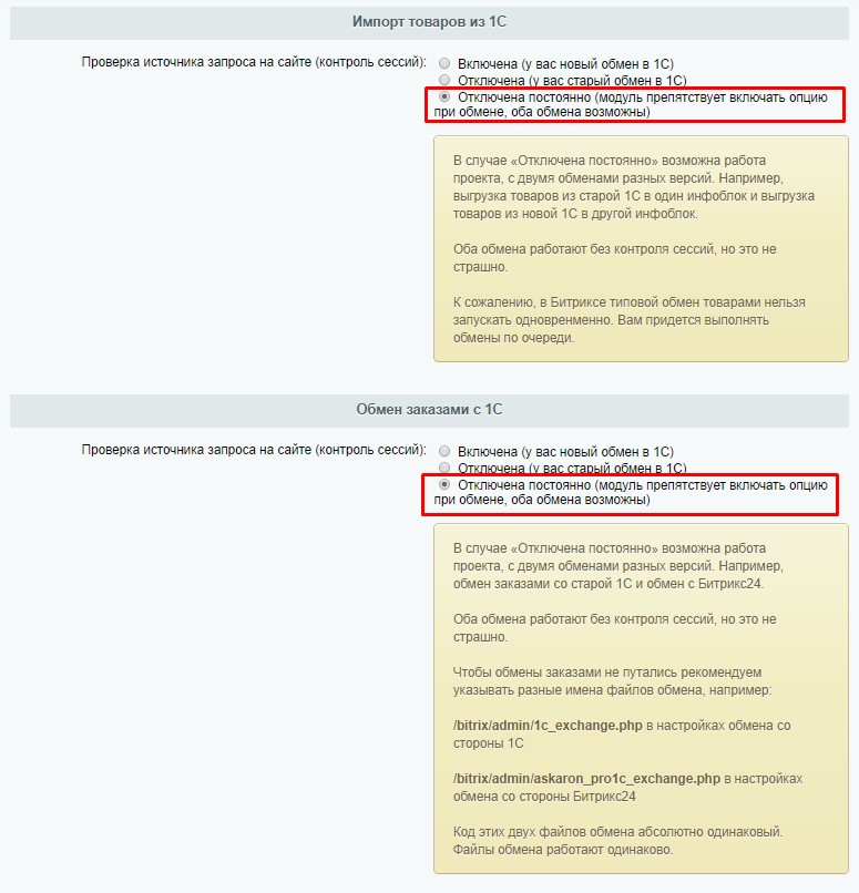 - новое в 2.0.0 добавлена страница, где можно отключить проверку источника запроса. Исправление ошибок после обновления Битрикса для старых 1С: