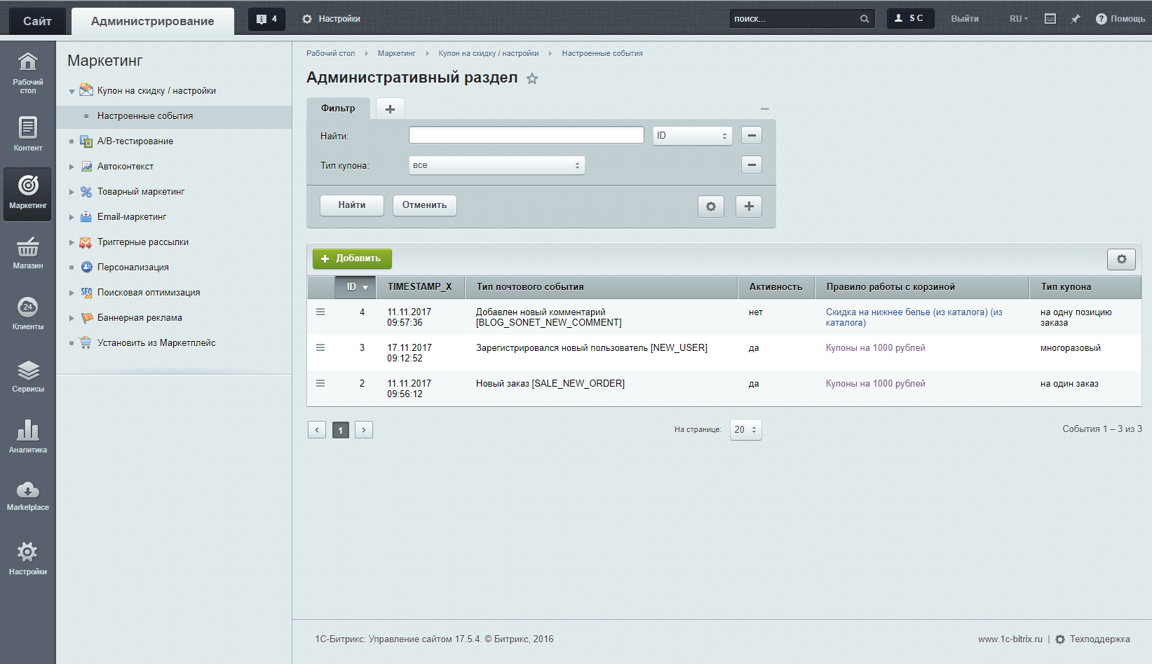 Маркетинг появится пункты: Купон на скидку / настройки событий-> Настроенные события можно, через которые можно настроить отправку купона на то или иное событие.