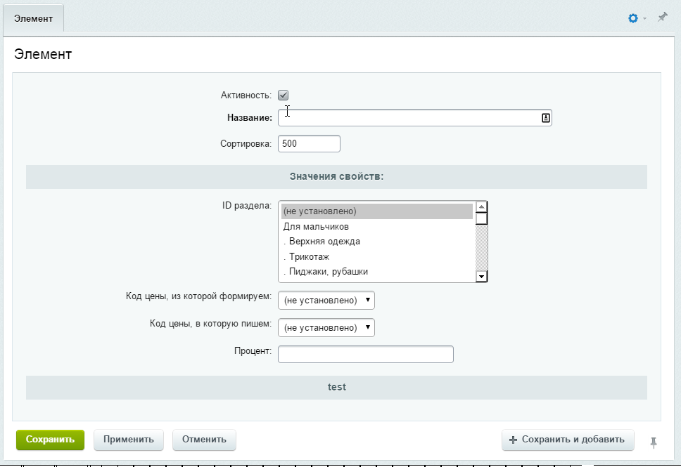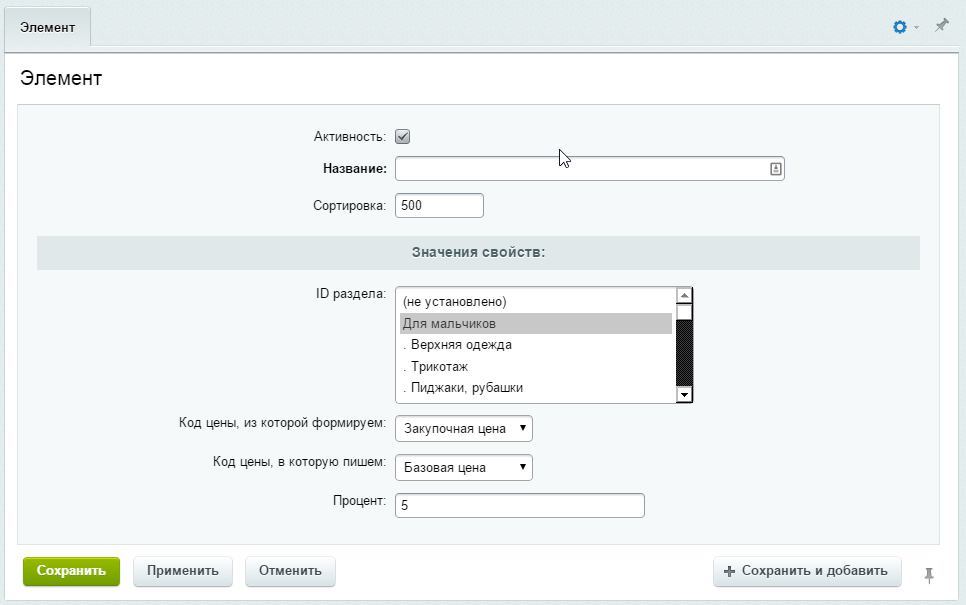 - Теперь можно приступать к созданию профилей наценок. Для этого нужно в инфоблоке с профилями создать новый элемент, указать раздел, который будет пересчитан, цену, из которой берутся исходные данные, и цену, куда будут помещены пересчитанные. Также нужно указать процент. Процент может быть отрицательный.