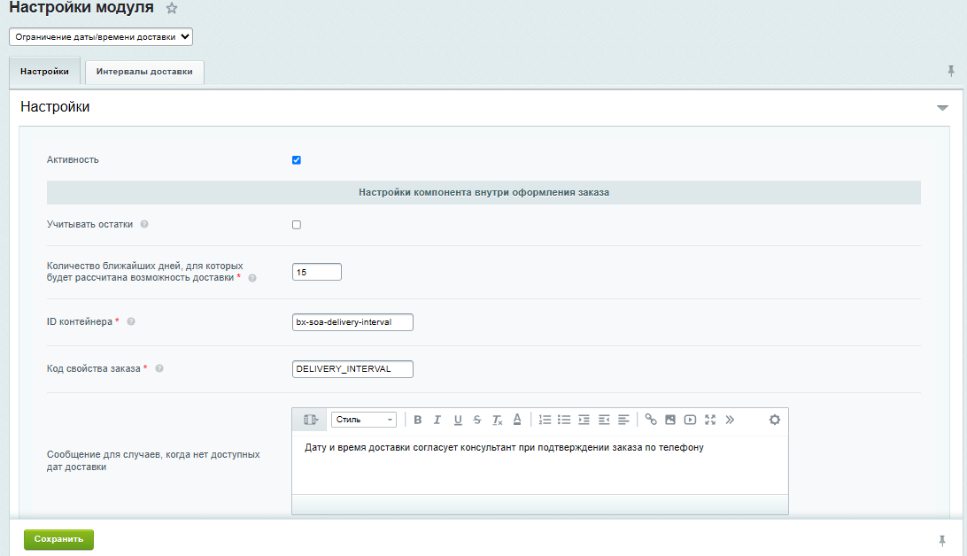 В процессе настройки вам потребуется создать или использовать существующее свойство заказа типа "Строка", в котором будет храниться выбранный день и интервал доставки.