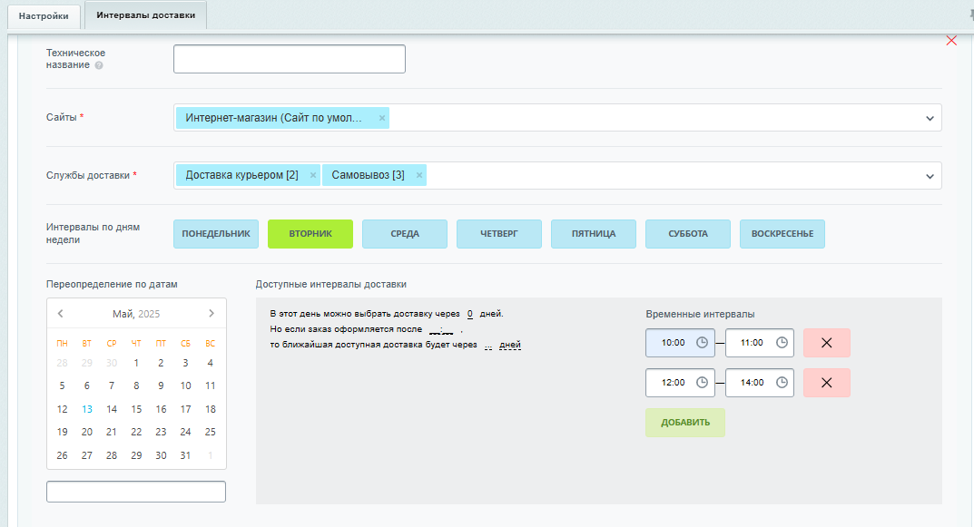 Можно задавать “базовые” интервалы доставки по дням недели и переопределять их в календаре для определенных дат