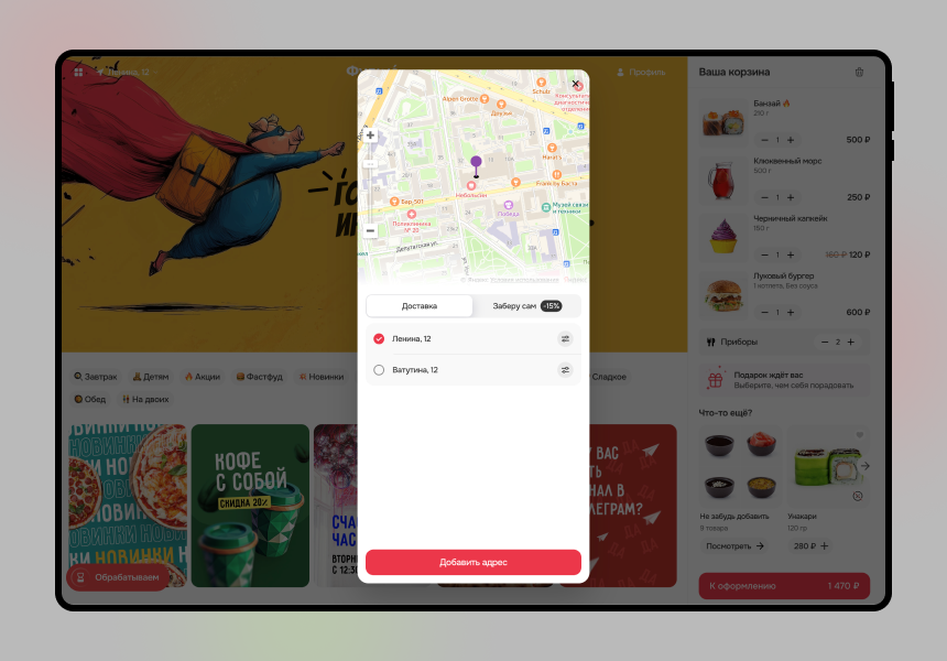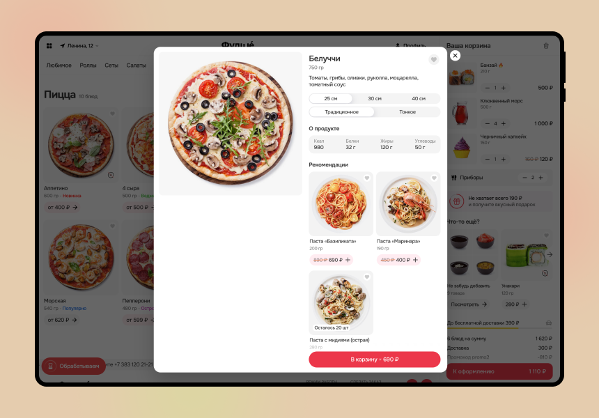 Современное решение для доставки еды, пиццы и суши. Идеально подходит для редакций "Старт" и "Стандарт"