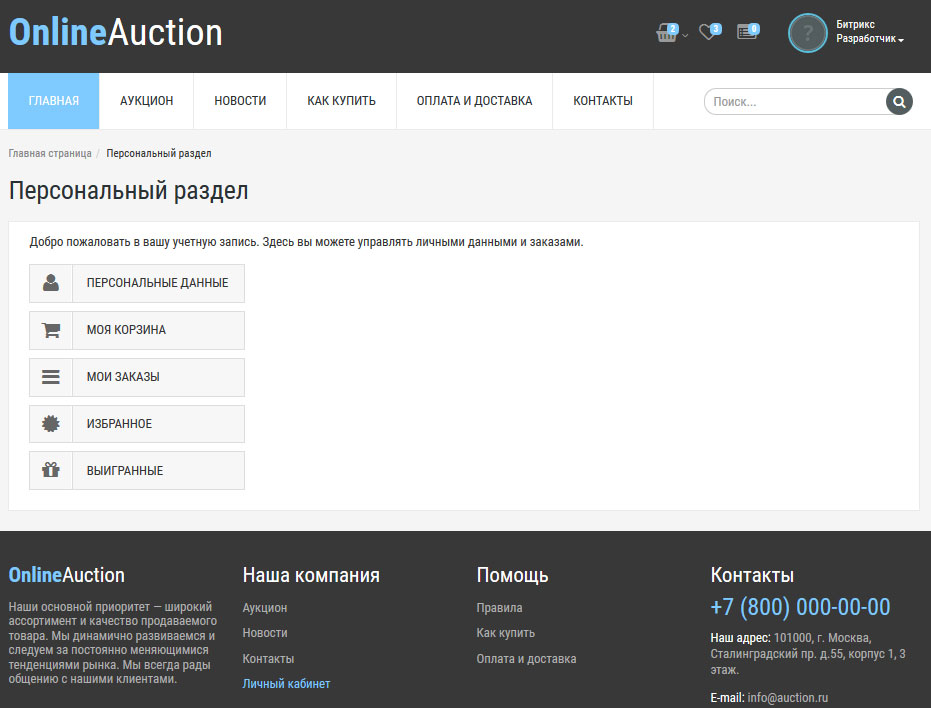 - продающая главная страница (Новинки, Рекомендованные лоты, Закрывающиеся лоты, Новостная лента и Краткая информацию о сайте)