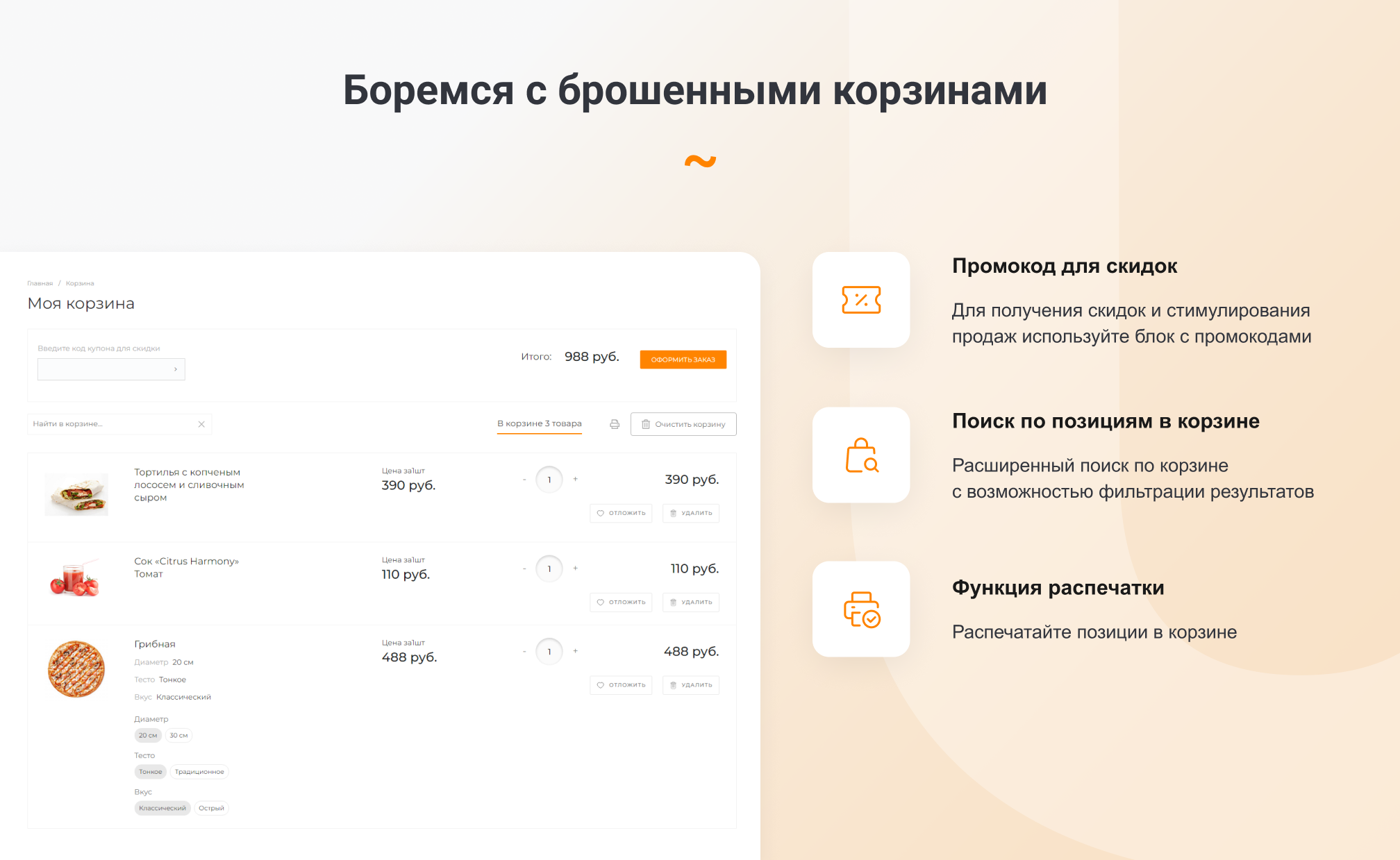 скидок и стимулирования продаж используйте блок с промокодом, распечатайте позиции в корзине,