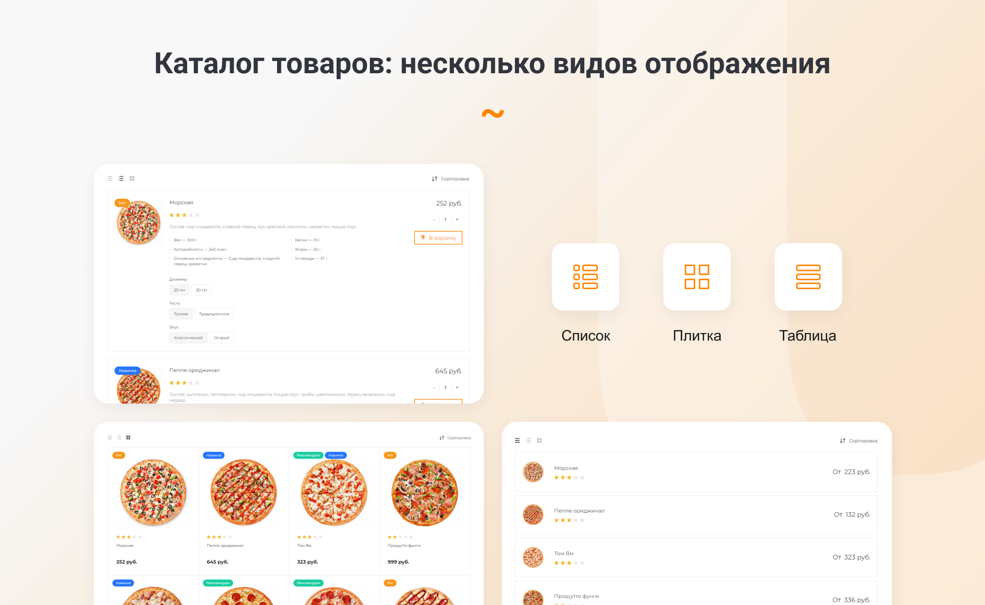 плитка, список, таблица. Сортировка товаров по умолчанию, цене, названию или рейтингу. Живой