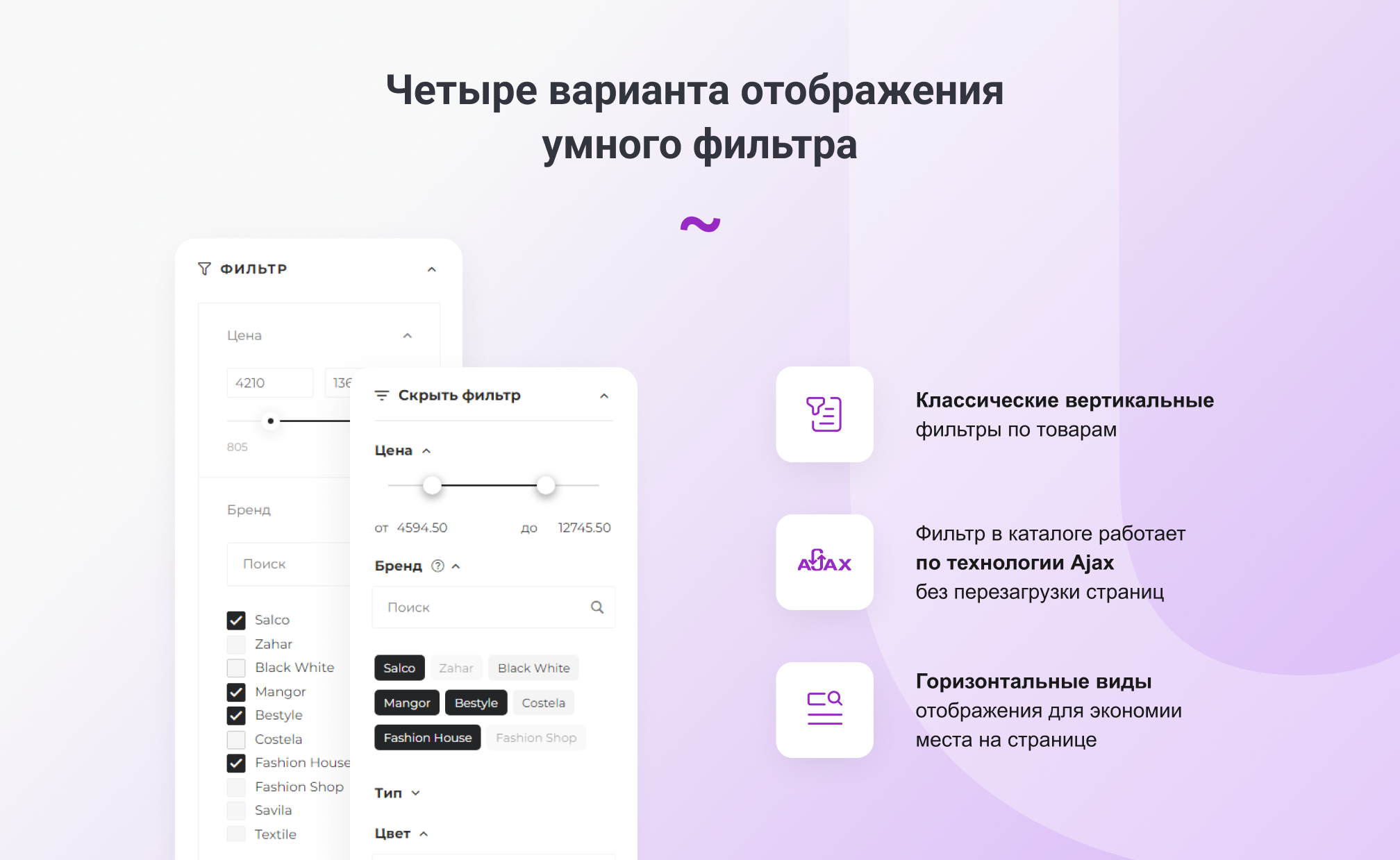 Фильтр в каталоге работает по технологии Ajax без перезагрузки страниц.