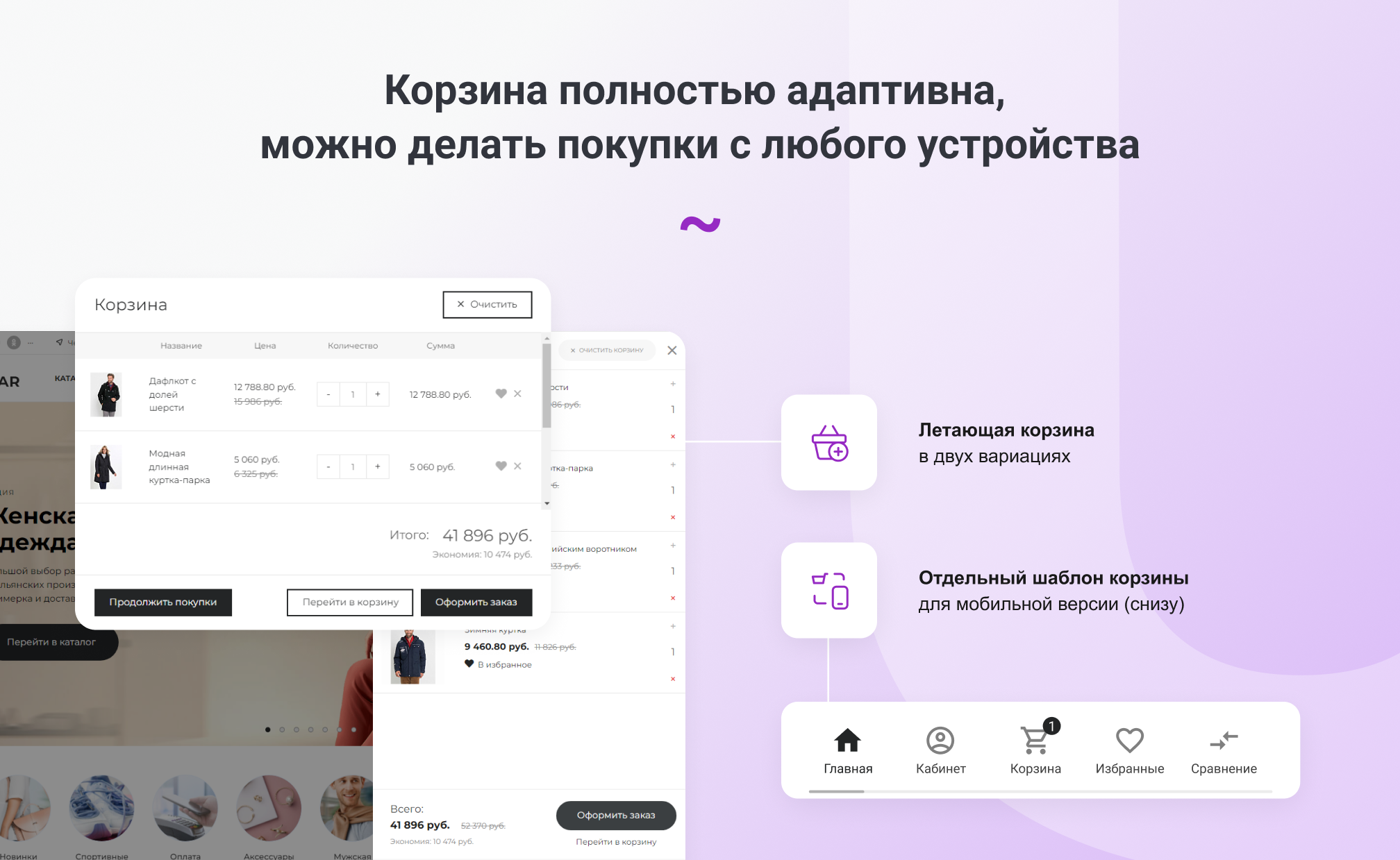 В решении реализована поддержка нового шаблона корзины от 1С-Битрикс, что позволяет выводить