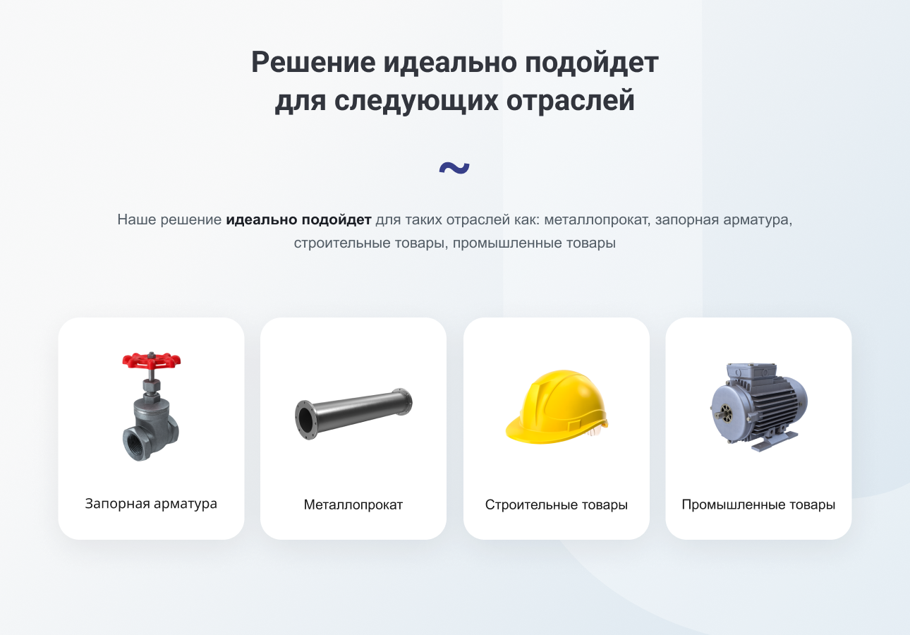 Наше решение идеально подойдет для таких отраслей как: металлопрокат, запорная арматура,