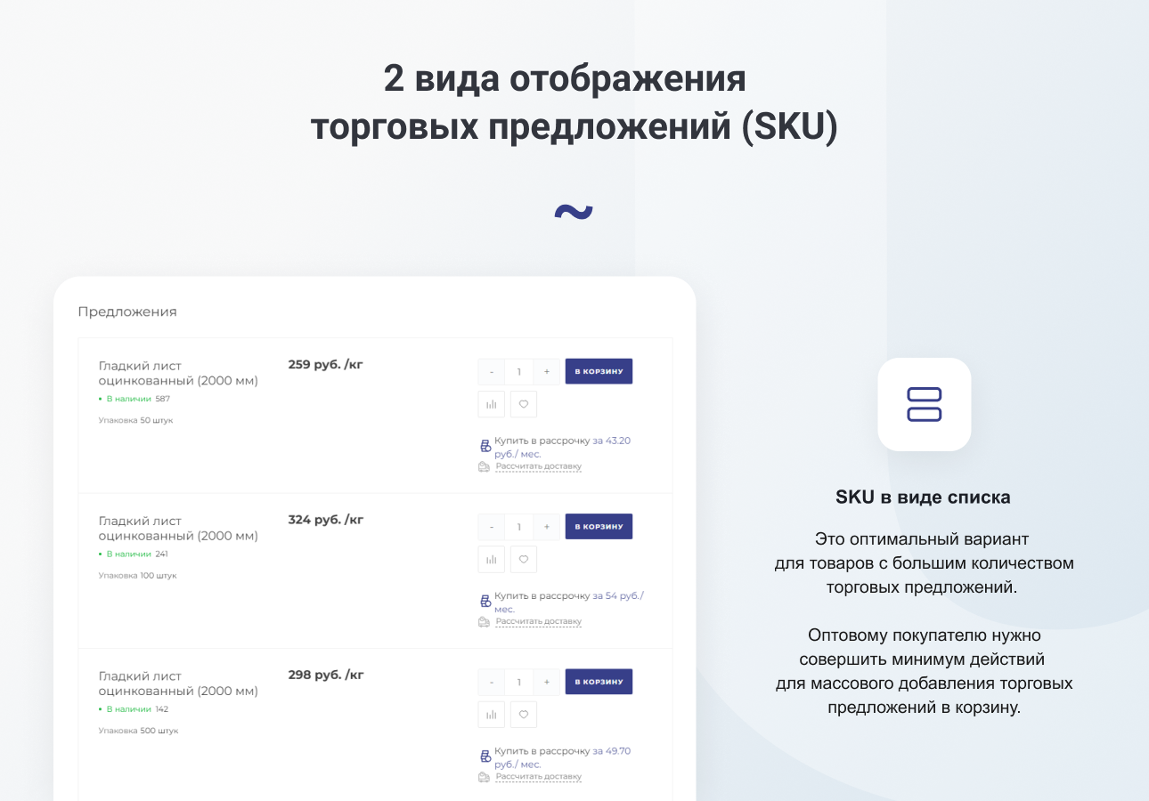 SKU в виде списка, это оптимальный вариант для товаров с большим количеством предложений.