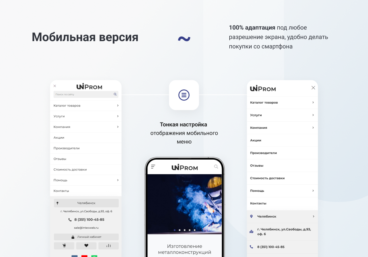 100% адаптация под любое разрешение экрана, удобно делать покупки со смартфона.