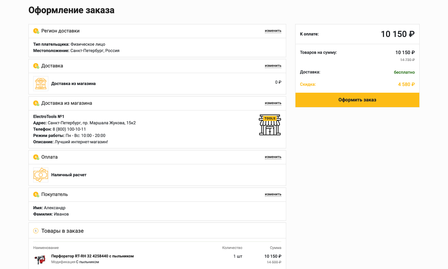 Оформление заказа позволяет за несколько шагов выбрать подходящий способ доставки и оплаты