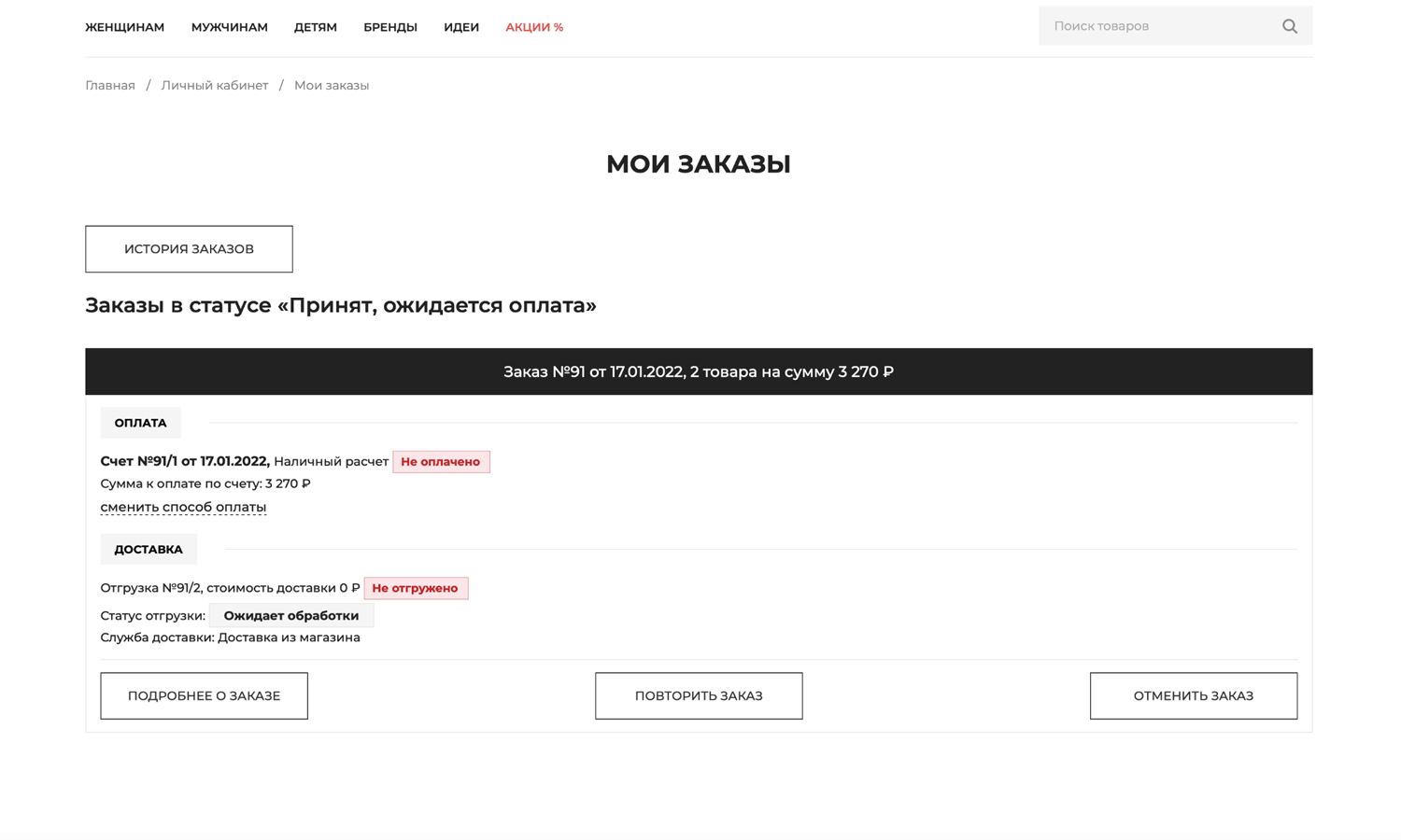 Личный кабинет даёт возможность следить за статусами заказов, изменять способ оплаты,