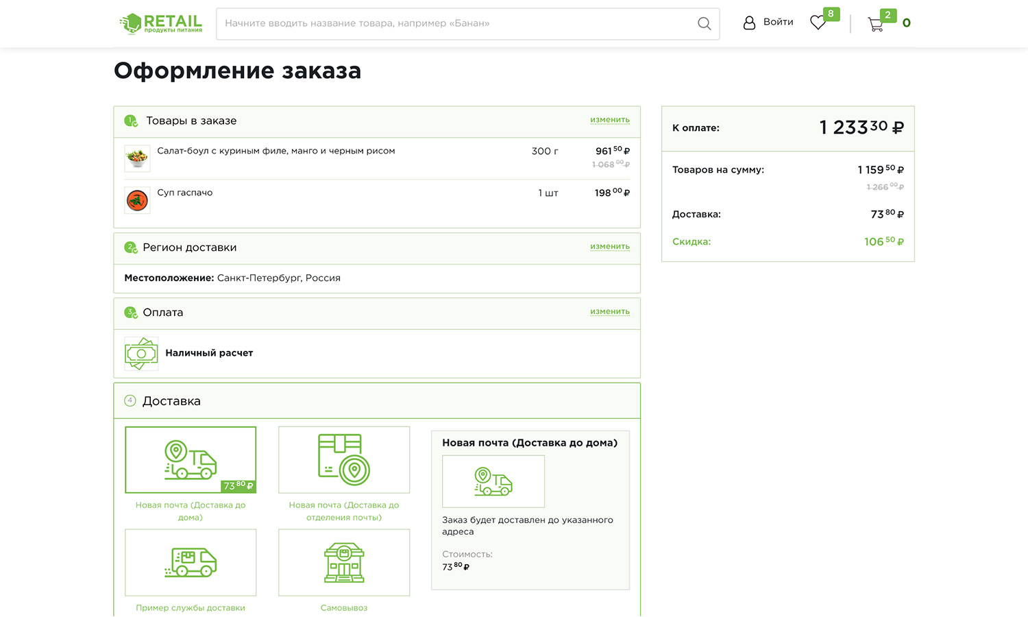 Оформление заказа позволяет за несколько шагов выбрать подходящий способ доставки