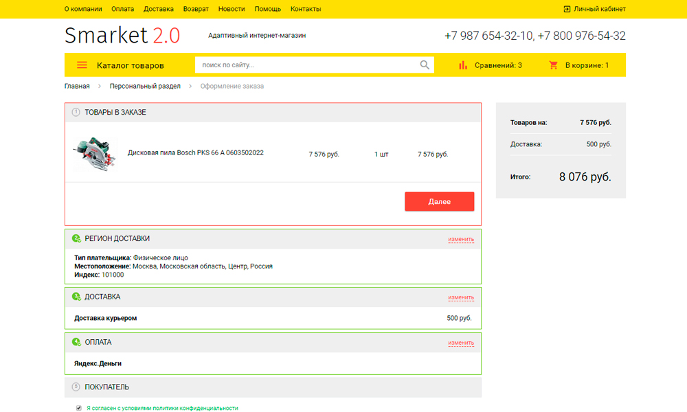 На данных этапах покупатель сможет: ознакомиться с товарами в корзине, получить скидку при наличии «купона на скидку» или участия в акции «при покупке больше N суммы», выбрать тип плательщика (физическое и юридическое лицо), выбрать способ доставки и оплаты (гибкая настройка позволяет предложить вашим покупателям широкий спектр способов доставки и оплаты своих покупок), указать информацию о себе.