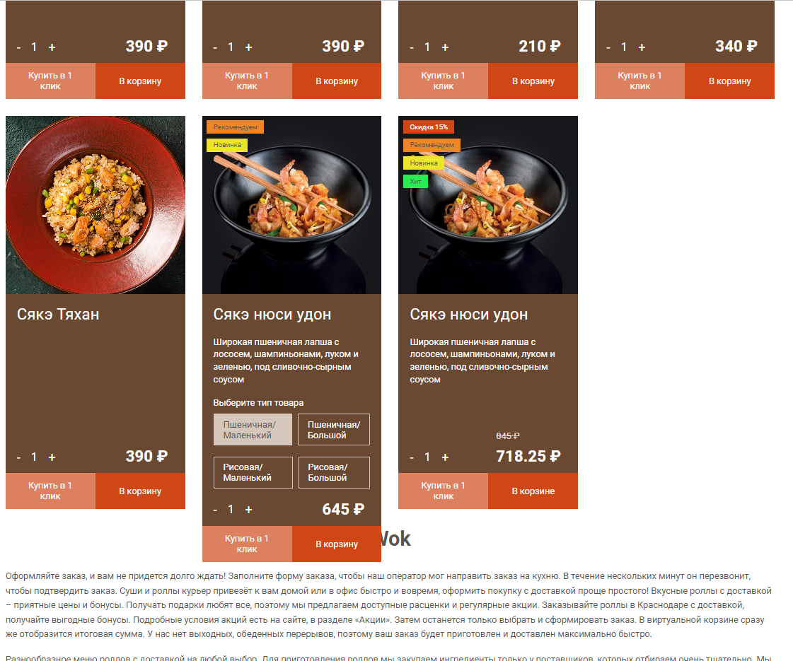 Основные разделы (суши,бургеры,WOK,салаты, закуски, пицца, супы, десерты, мясные блюда) и адаптивный каталог с неограниченным количеством товаров и категорий.