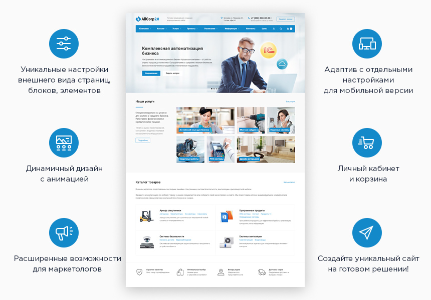 Аспро: Корпоративный сайт 2.0 — универсальное готовое решение для создания корпоративного сайта с конструктором посадочных страниц и простой интеграцией с CRM-системами. Идеален для презентации товаров и услуг любой тематики – от промышленного производства до образовательных курсов.