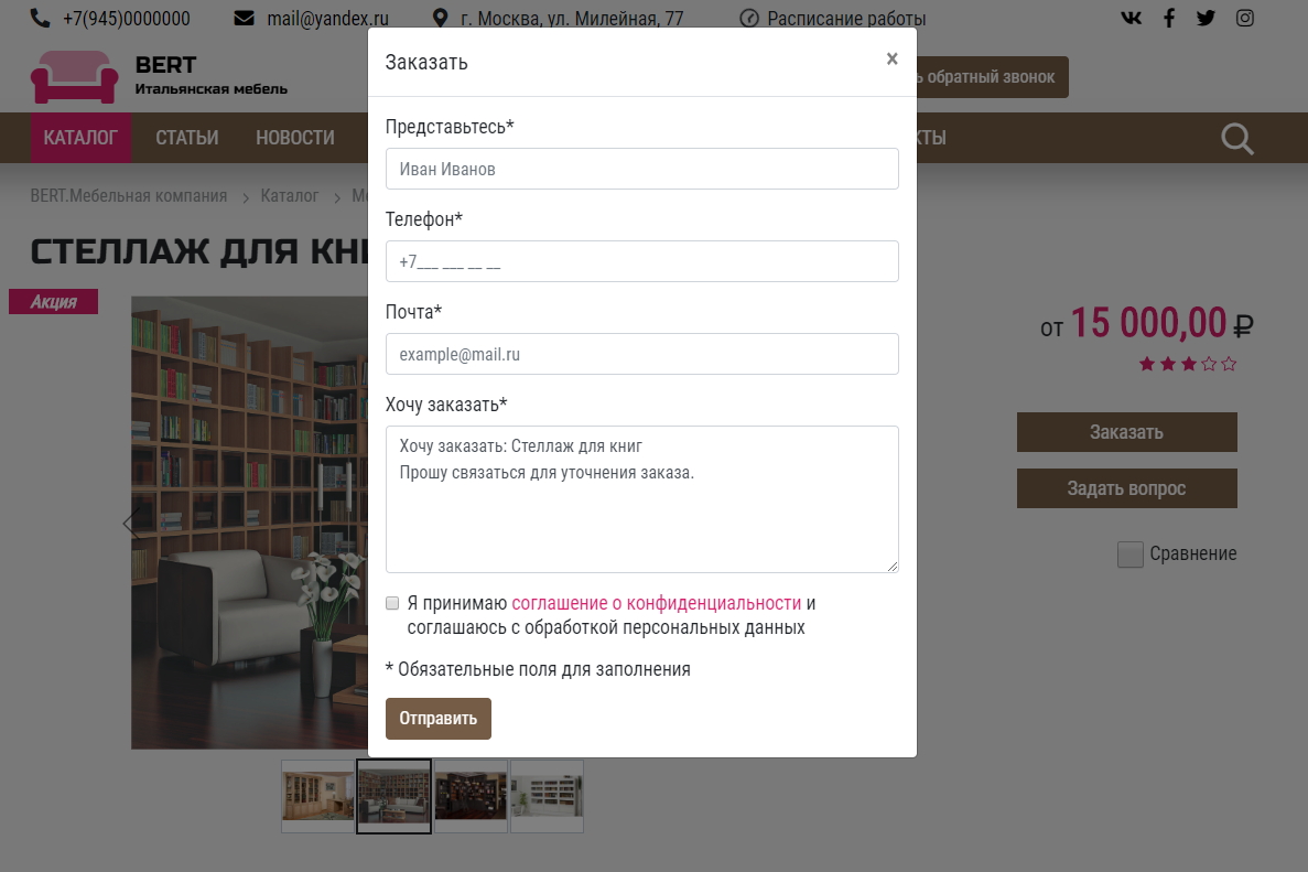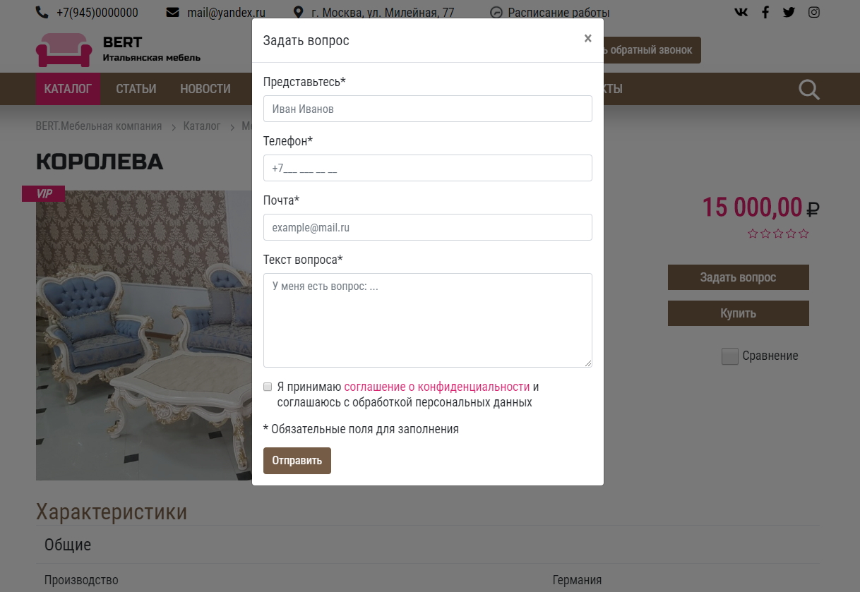 - Формы: Задать вопрос, Заказать товар, Заказать звонок