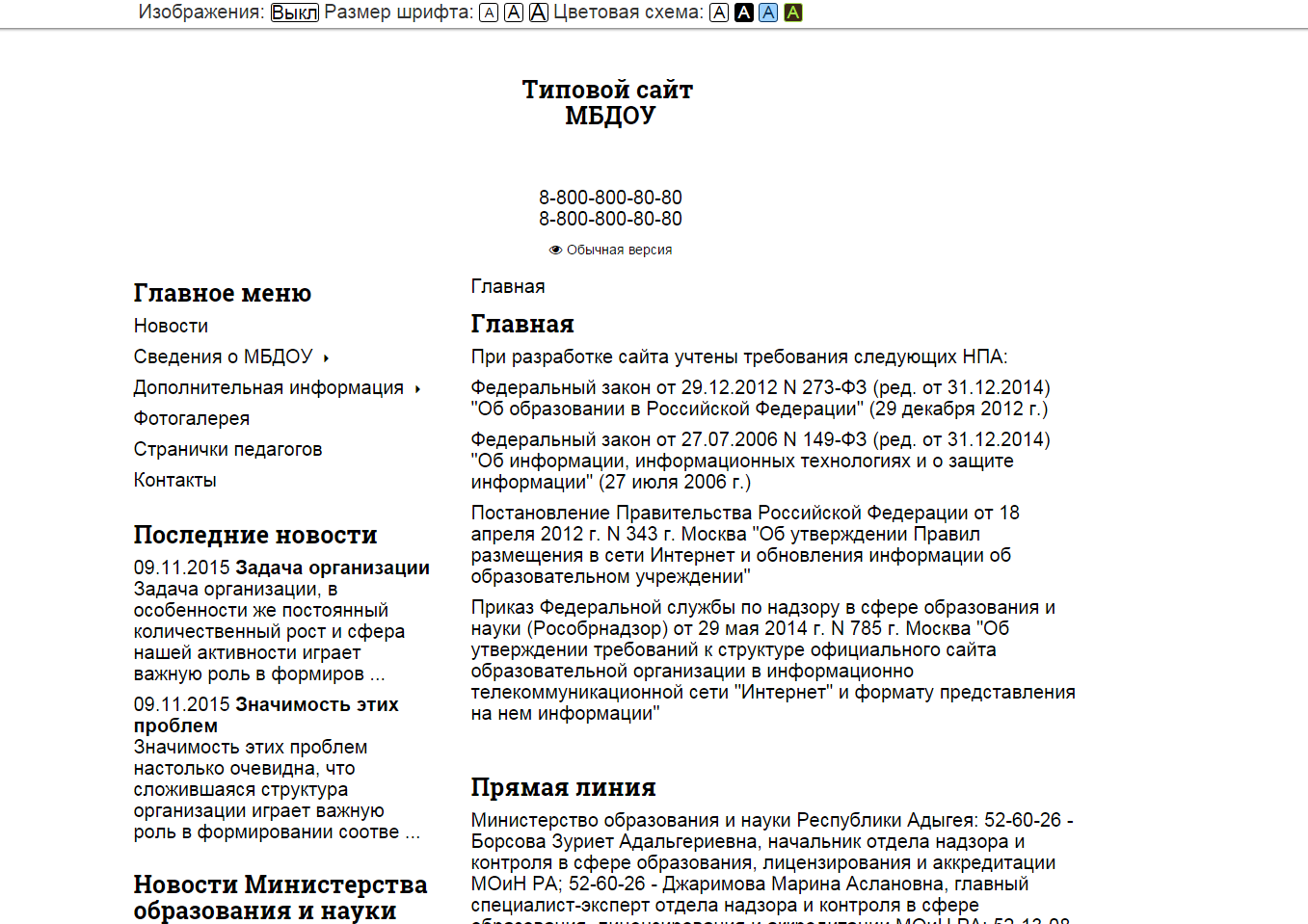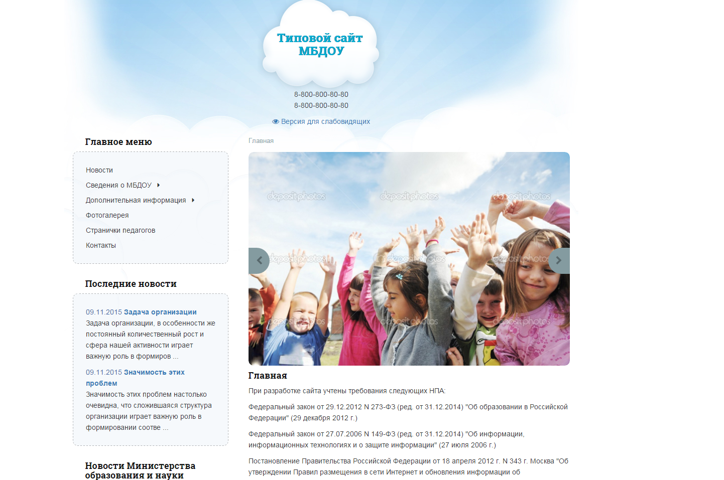 Типовой сайт МБДОУ - выполнен в соответствии с приказом Рособрнадзора от 29 мая 2014 г. N 785 г. Москва "Об утверждении требований к структуре официального сайта образовательной организации в информационно телекоммуникационной сети "Интернет" и формату представления на нем информации".