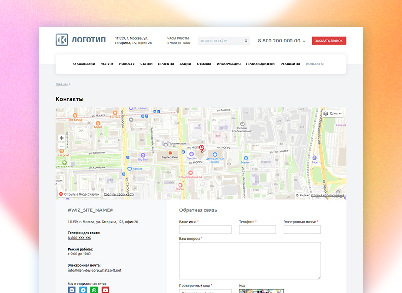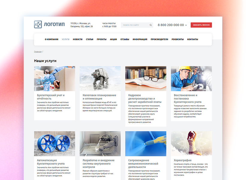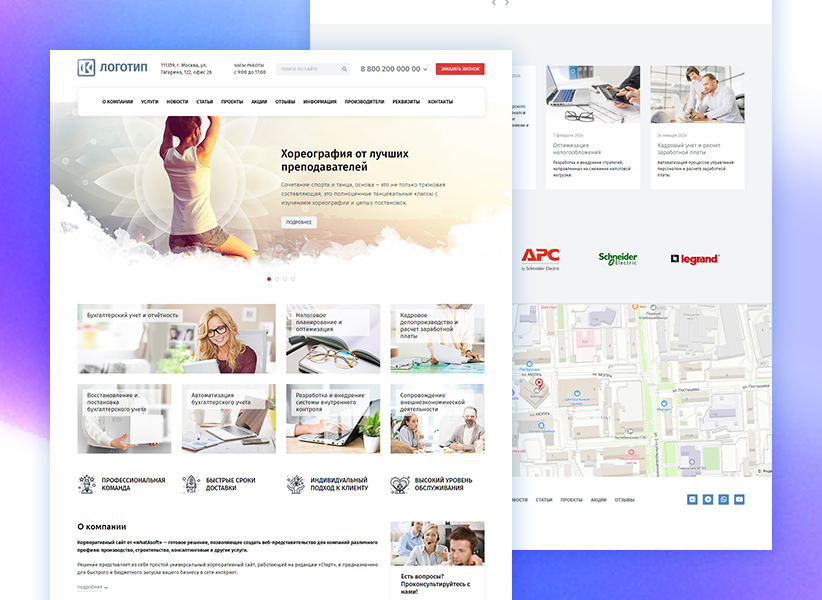 Адаптивный шаблон корпоративного сайта. Каталог услуг, статьи, отзывы, новости и т.д.