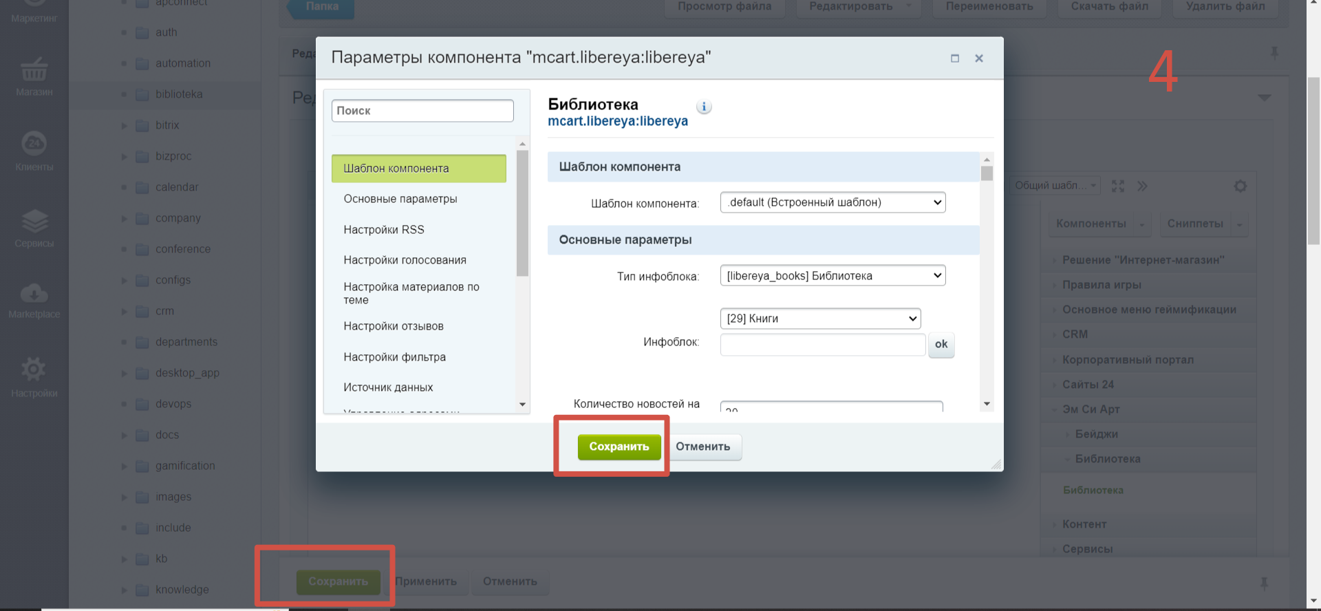 5. Далее в визуальном редакторе добавьте на страницу компонент «Библиотека» (см. скриншот 2).