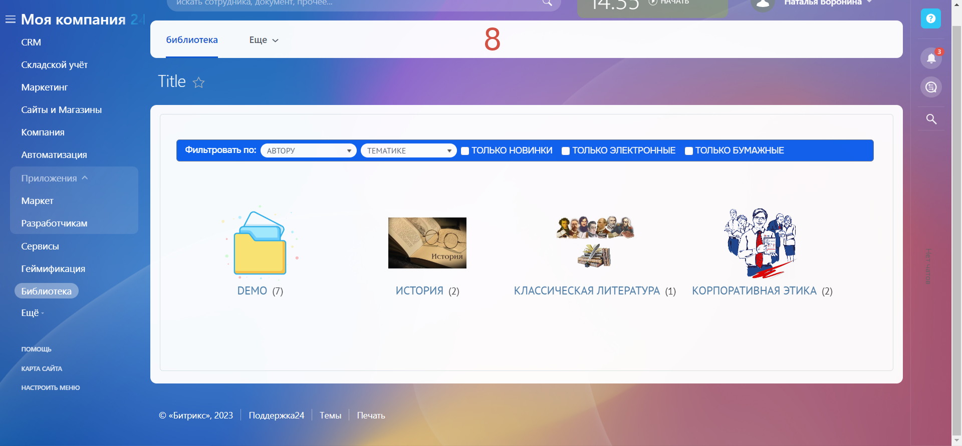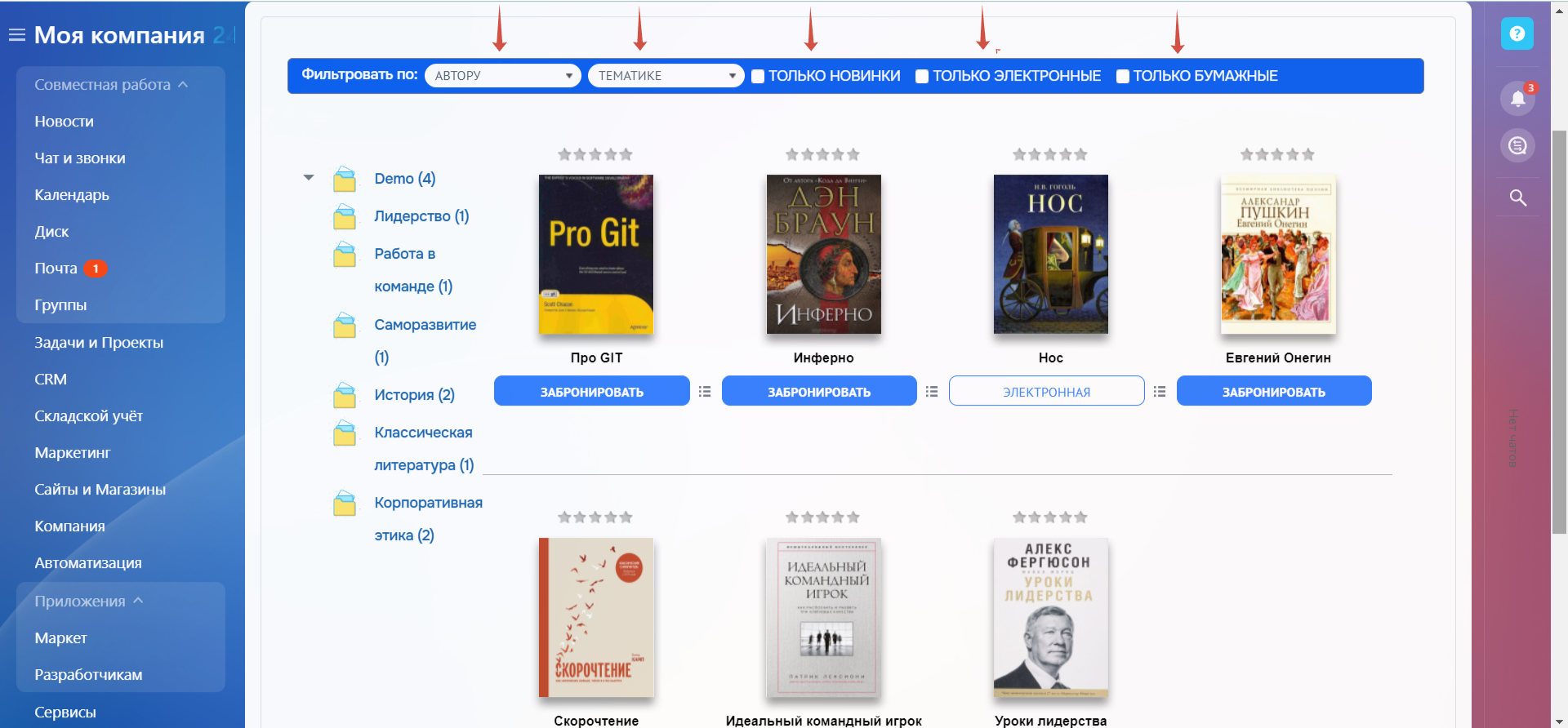 Библиотека подразумевает размещение электронных версий книг на вашем портале, а также возможность резервирования бумажных версий.